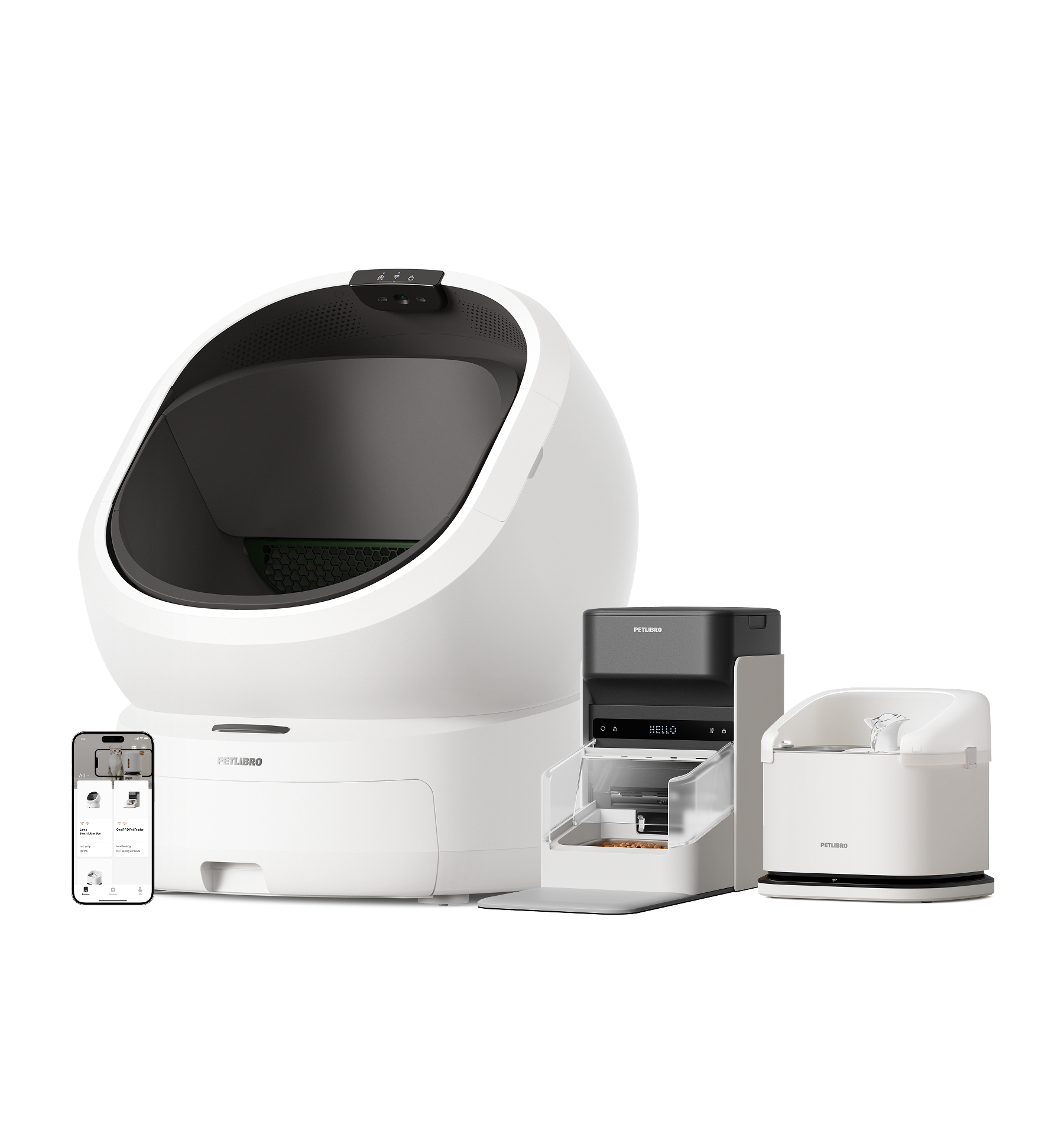 The Luma self-cleaning litter box analyzes cat waste for early health detection. The automatic feeder provides scheduled, personalized meals via RFID tags. The smart fountain tracks multi-cat hydration with real-time app alerts. Together, they deliver comprehensive health monitoring and effortless care for your pets.